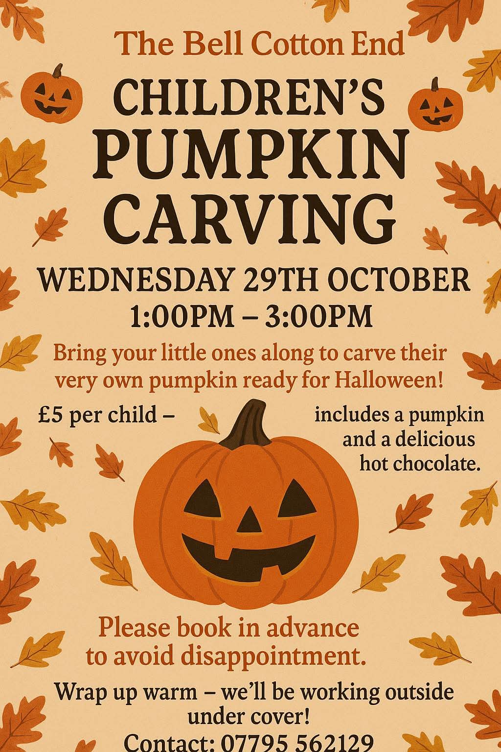 Get ready for some spooky fun this Halloween! Join us at The Bell Cotton End for a delightful Children’s Pumpkin Carving session.