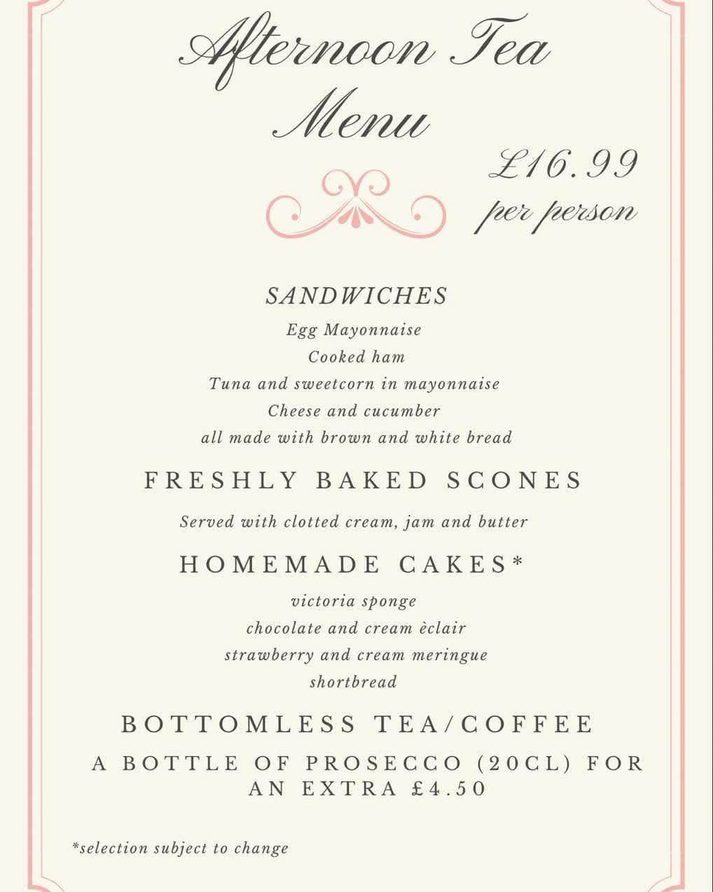 There will be a selection of delicious sandwiches, scones and cakes and glass of bubbly on arrival. Every mum will receive a gift.