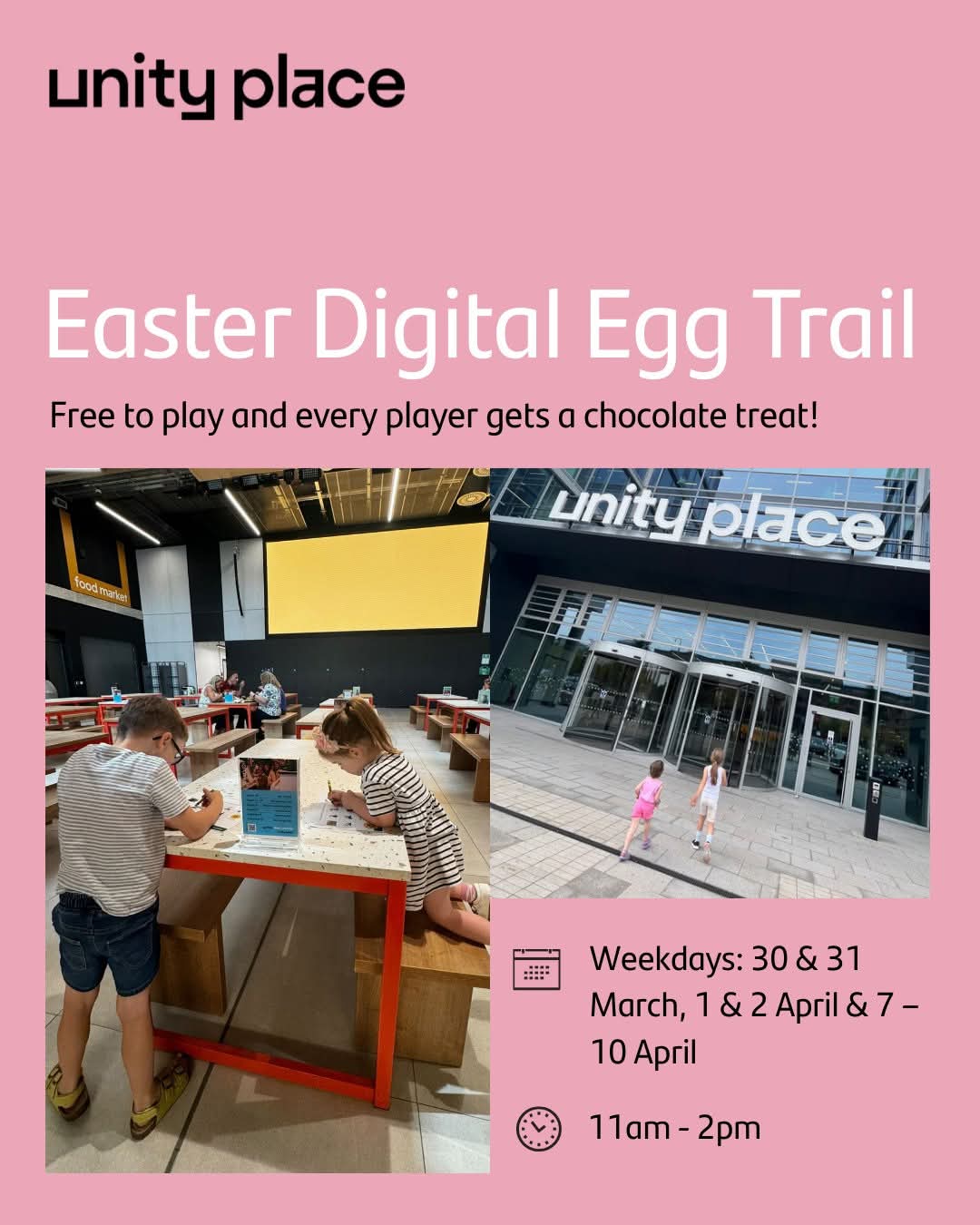 Join our FREE Digital Egg Trail and follow the clues across our big screens to spot every hidden egg around Unity Place, Milton Keynes. Find them all and every player gets a chocolate treat.