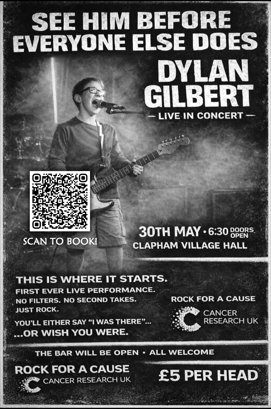 🎤 Dylan Gilbert will be LIVE at Clapham Village Hall on Saturday 30th May 2026 from 6:30pm - 10pm.