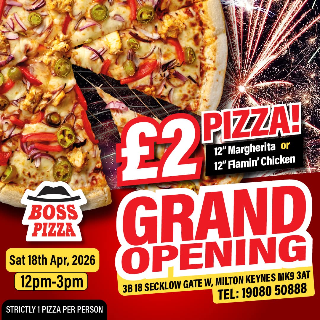 💥 £2 Pizza at Boss Pizza Opening Party - Milton Keynes