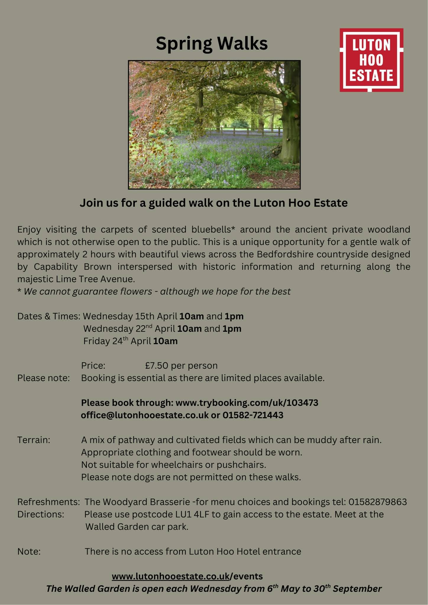 This is a unique opportunity for a gentle walk of approximately 2 hours with beautiful views across the Bedfordshire countryside designed by Capability Brown interspersed with historic information and returning along the majestic Lime Tree Avenue.
