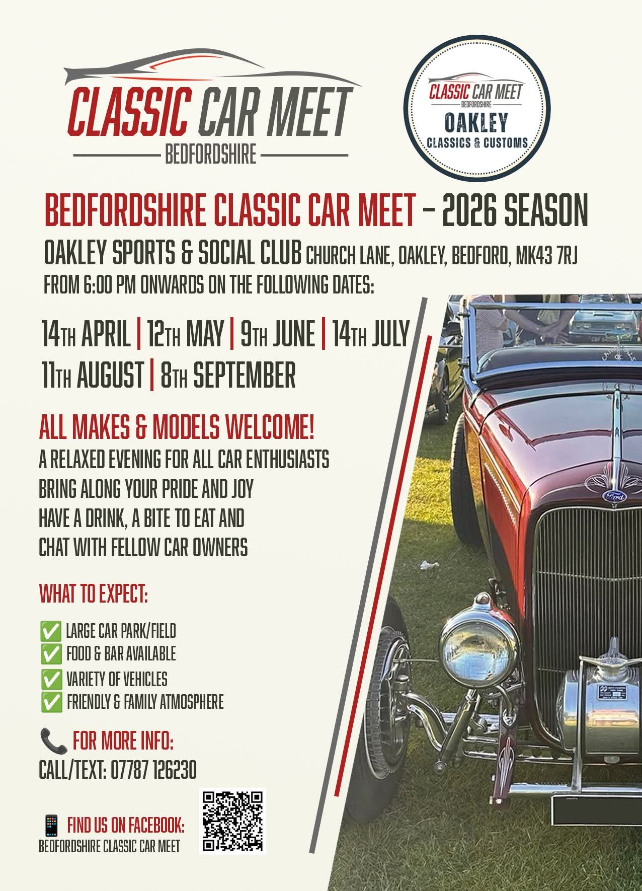🚗 The Bedfordshire Classic Car Meet returns for the 2026 season at Oakley Sports & Social Club from 6pm onwards!