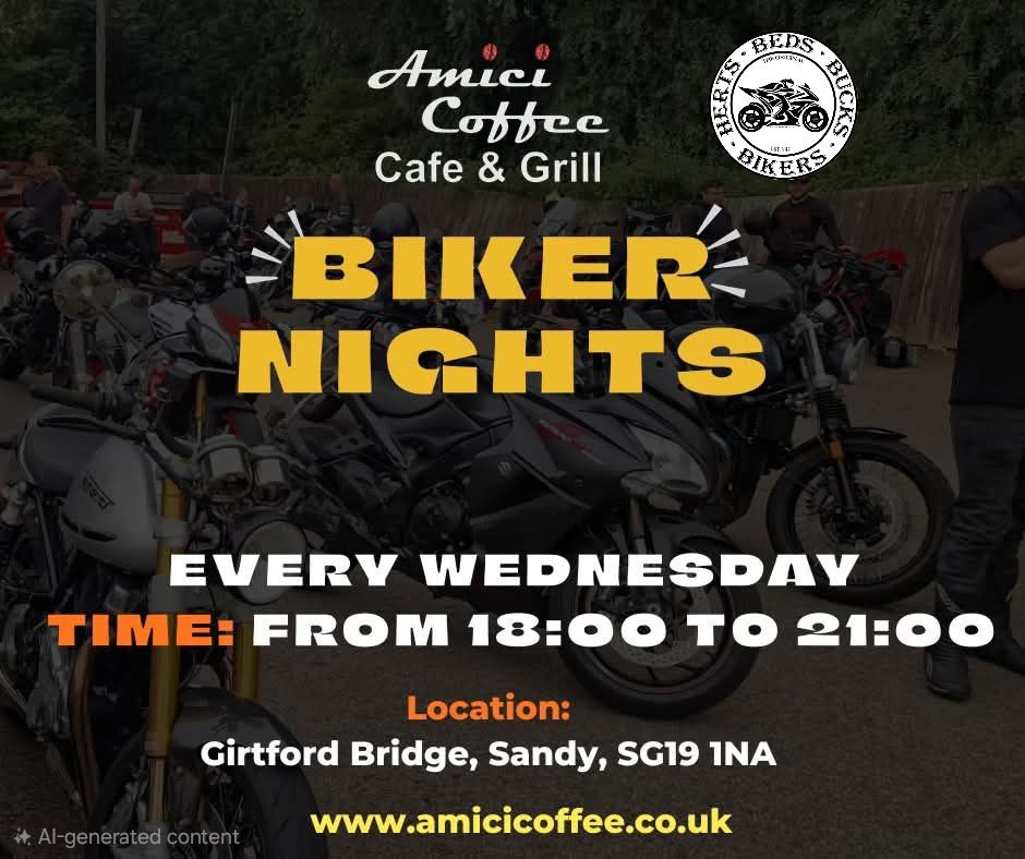 Held at Alicia's Coffee, Girtford Bridge, Sandy, popular midweek bike meets bring together bikes, burgers, coffee and a great crowd from 6pm to 9pm. Whether you’re riding in, meeting mates, or just fancy soaking up the atmosphere, everyone is welcome.