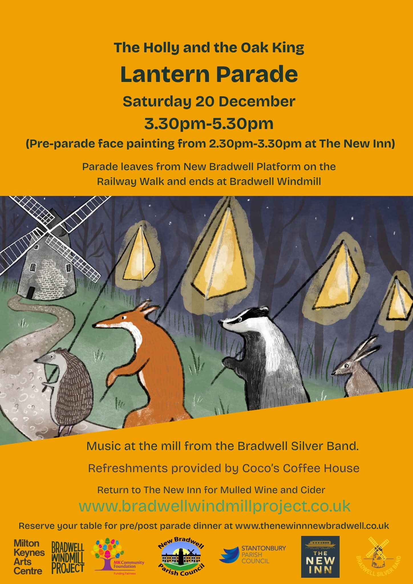The parade is due to arrive at the Mill at 4pm, at which time visitors will hear the story of The Holly and the Oak King as narrated by children through working with Milton Keynes artist and writer, Deborah Fielding. Bradwell Silver Band will be performing and hot refreshments will be provided by Coco’s Coffee House.