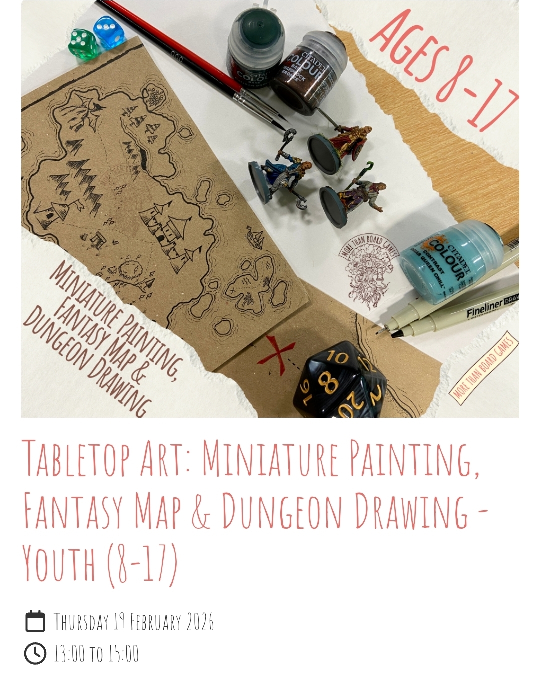 Under 13's are to be accompanied by an adult. miniature painting is only suitable for ages 12+. Map & Dungeon Drawing is suitable for ages 8+.